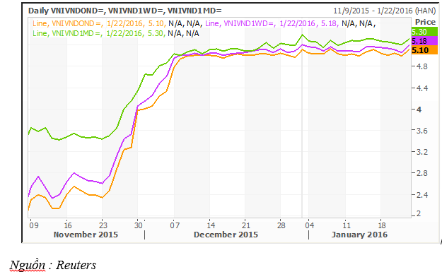 Cụ thể, lãi suất bình quân kỳ hạn qua đêm ngày 22/1 là 5,1%/năm (đường màu cam phía dưới), tăng 0,06% so với cuối tuần trước; lãi suất bình quân kỳ hạn 1 tuần và 1 tháng lần lượt là 5,18%/năm (đường màu tím phía dưới) và 5,30%/năm (đường màu xanh lá cây phía dưới), cùng tăng 0,04% so với cuối tuần trước.