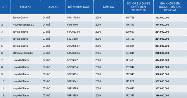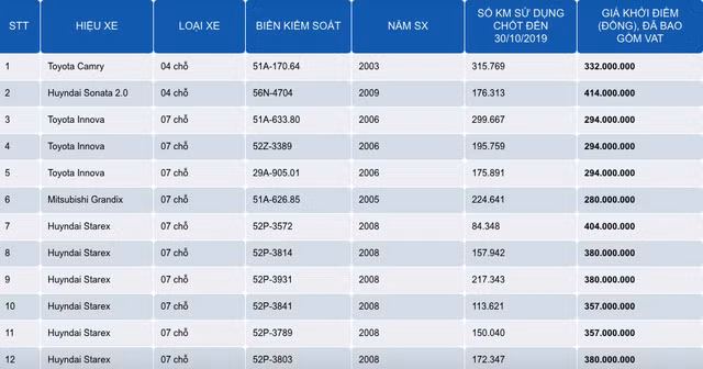 Một lô xe ô tô gồm 20 chiếc từ 4 đến 7 chỗ mới đây được một ngân hàng rao bán thanh lý với tổng giá trị lên tới 6,2 tỷ đồng. Theo đó, giá khởi điểm của những chiếc xe này đã bao gồm thuế VAT thấp nhất là 152 triệu đồng.