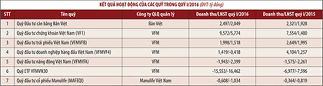 Về quỹ, hiện có 7 quỹ đầu tư công bố kết quả hoạt động trong quý I/2016, trong đó có 4 quỹ thua lỗ. 3/5 quỹ do CTCP Quản lý quỹ đầu tư Việt Nam (VFM) quản lý ghi nhận kết quả đầu tư lỗ gồm: Quỹ đầu tư doanh nghiệp hàng đầu Việt Nam (VFMVF4), Quỹ đầu tư năng động Việt Nam (VFMVFA) và Quỹ ETF VFMVN30.