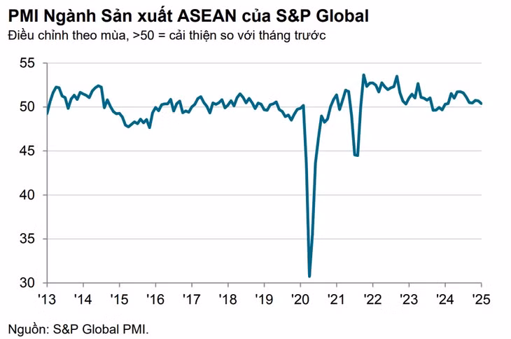 Chỉ số Nhà quản trị mua hàng (PMI) ngành sản xuất ASEAN đạt 50,4 điểm trong tháng 1/2025, giảm so với 50,7 điểm của tháng 12/2024 và là mức thấp nhất trong gần 1 năm.