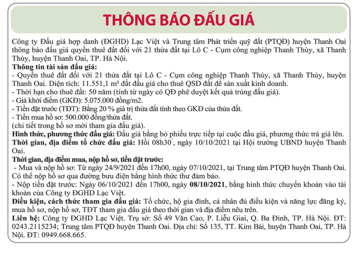 (BĐT) - Công ty Đấu giá hợp danh Lạc Việt và Trung tâm Phát triển quỹ đất huyện Thanh Oai thông báo đấu giá tài sản vào ngày 10/10/2021 như sau: