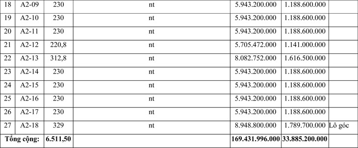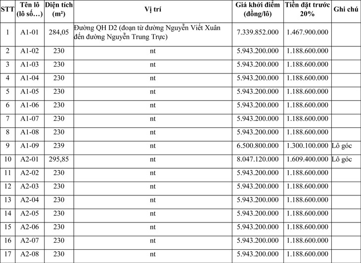 - Tiền đặt trước: 20% (Hai mươi phần trăm) giá khởi điểm của từng lô đất.