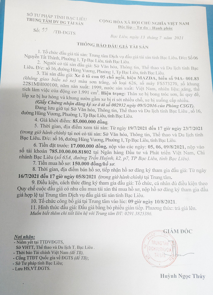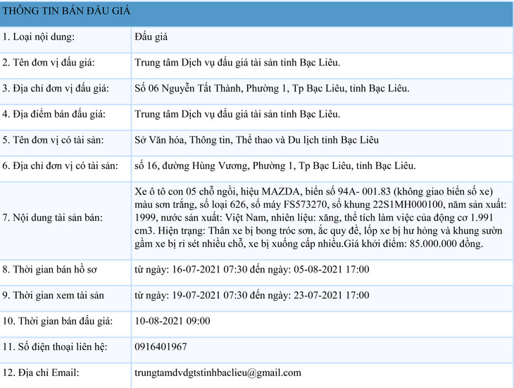 Xe ô tô con 05 chỗ ngồi, hiệu MAZDA, biển số 94A- 001.83 (không giao biển số xe) màu sơn trắng, số loại 626, số máy FS573270, số khung 22S1MH000100, năm sản xuất: 1999, nước sản xuất: Việt Nam, nhiên liệu: xăng, thể tích làm việc của động cơ 1.991 cm3. Hiện trạng: Thân xe bị bong tróc sơn, ắc quy đề, lốp xe bị hư hỏng và khung sườn gầm xe bị rỉ sét nhiều chỗ, xe bị xuống cấp nhiều. Giá khởi điểm: 85.000.000 đồng.
