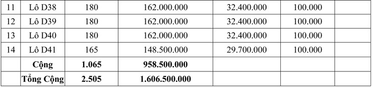 - Tổng số lô đất, diện tích đất đấu giá: 14 lô với tổng diện tích 2.505 m2; (kèm theo danh sách chi tiết).