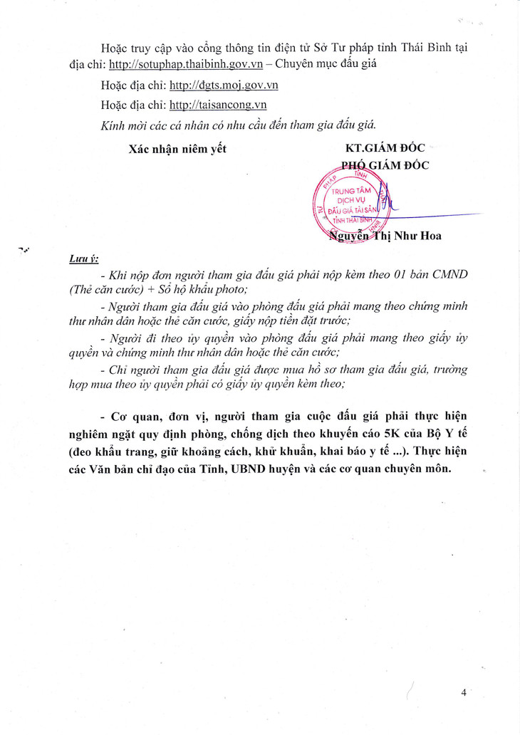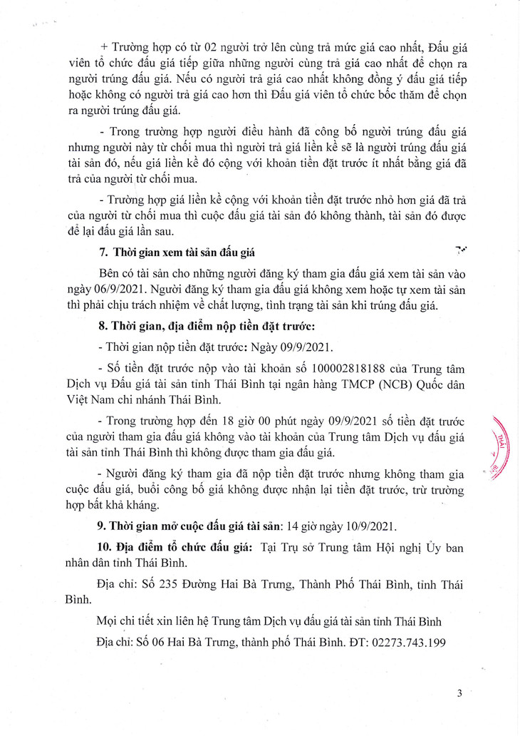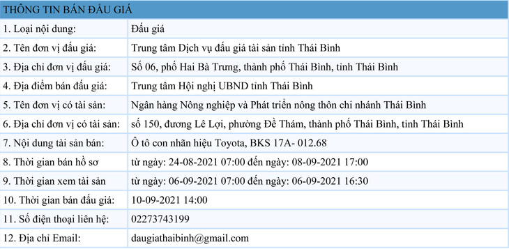 (BĐT) - Trung tâm Dịch vụ đấu giá tài sản tỉnh Thái Bình thông báo đấu giá tài sản vào ngày 10/9/2021 do Ngân hàng Nông nghiệp và Phát triển nông thôn chi nhánh Thái Bình ủy quyền như sau: