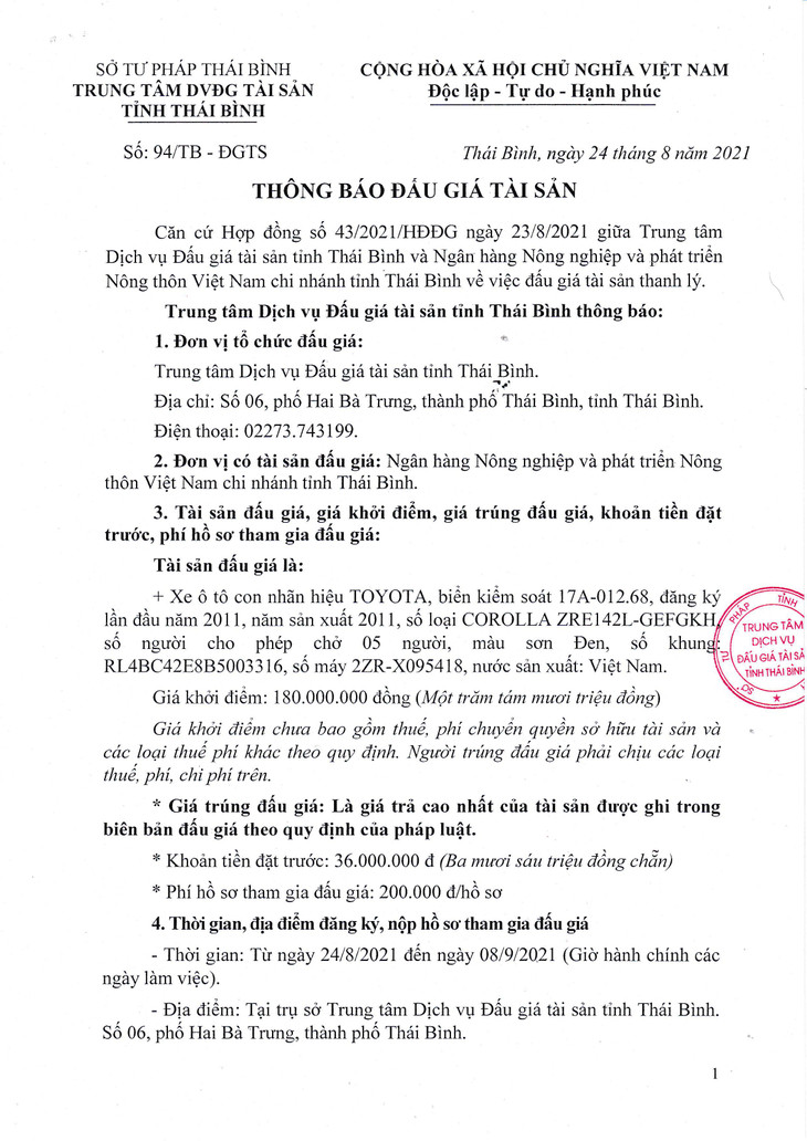 Ngày 10/9/2021, đấu giá xe ô tô Toyota tại tỉnh Thái Bình