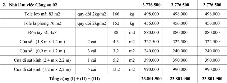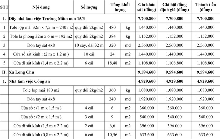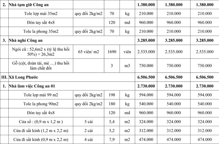 - Vật tư thu hồi: Dãy nhà làm việc Trường Mầm non 15/3; Công an xã Long Chữ: nhà làm việc, nhà tạm giữ, nhà nghỉ; Công an xã Long Phước: nhà làm việc 1, nhà làm việc 2 (kèm theo Danh mục tài sản xã Long Chữ, Long Phước và Trường Mầm non 15/3).