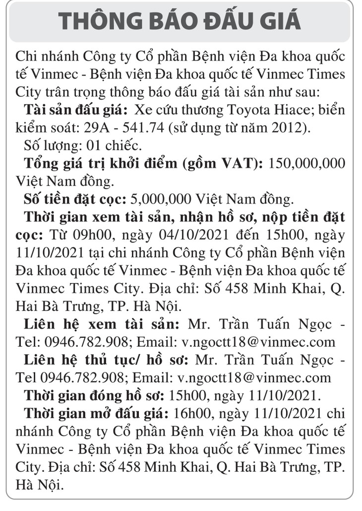 (BĐT) - Chi nhánh Công ty CP Bệnh viện Đa khoa quốc tế Vinmec – Bệnh viện Đa khoa quốc tế Times City thông báo đấu giá tài sản vào ngày 11/10/2021 như sau:
