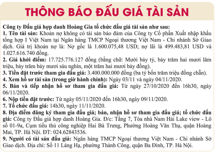 Ngày 11/11/2020, đấu giá khoản nợ của Công ty CP XNK tổng hợp 1 Việt Nam tại VCB Chi nhánh Sở giao dịch