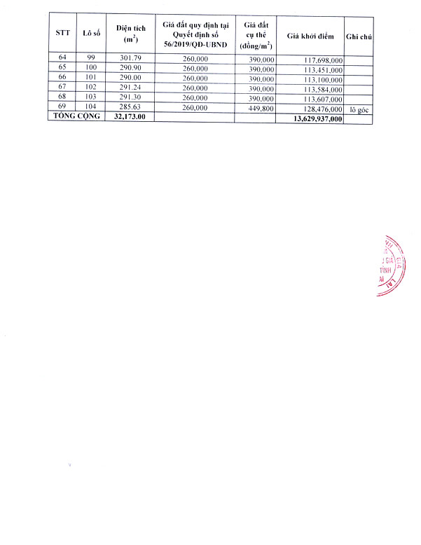 - Tổng giá khởi điểm: 13.629.937.000 đồng (Bằng chữ: Mười ba tỷ sáu trăm hai mươi chín triệu chín trăm ba mươi bảy nghìn đồng)