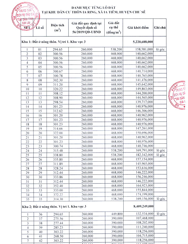 3- Tài sản đấu giá: Đấu giá Quyền sử dụng đất để giao đất có thu tiền sử dụng đất tại Khu dân cư thôn Ia Ring, xã Ia Tiêm, huyện Chư Sê, tỉnh Gia Lai, cụ thể: