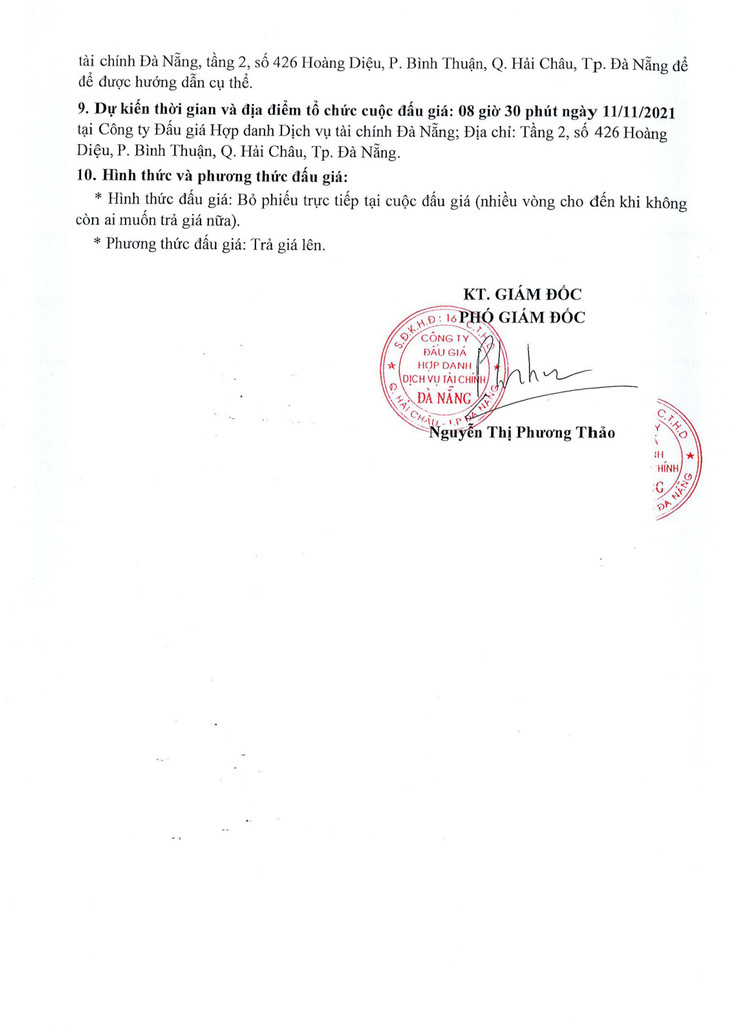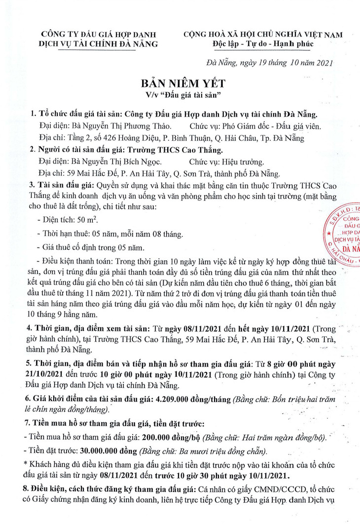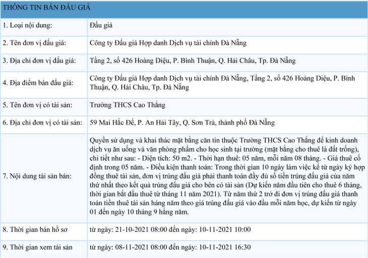 (BĐT) - Công ty Đấu giá hợp danh Dịch vụ tài chính Đà Nẵng thông báo đấu giá tài sản vào ngày 11/11/2021 do Trường THCS Cao Thắng ủy quyền như sau: