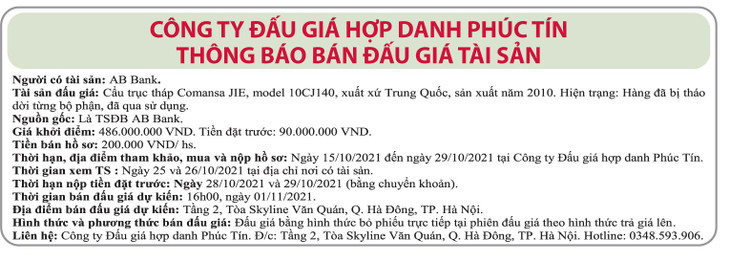 (BĐT) - Công ty Đấu giá hợp danh Phúc Tín thông báo đấu giá tài sản vào ngày 1/11/2021 do ABBank ủy quyền như sau: