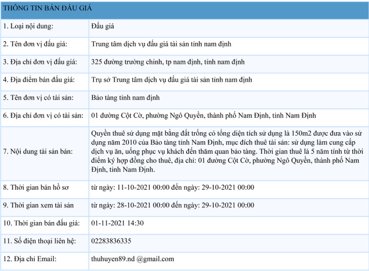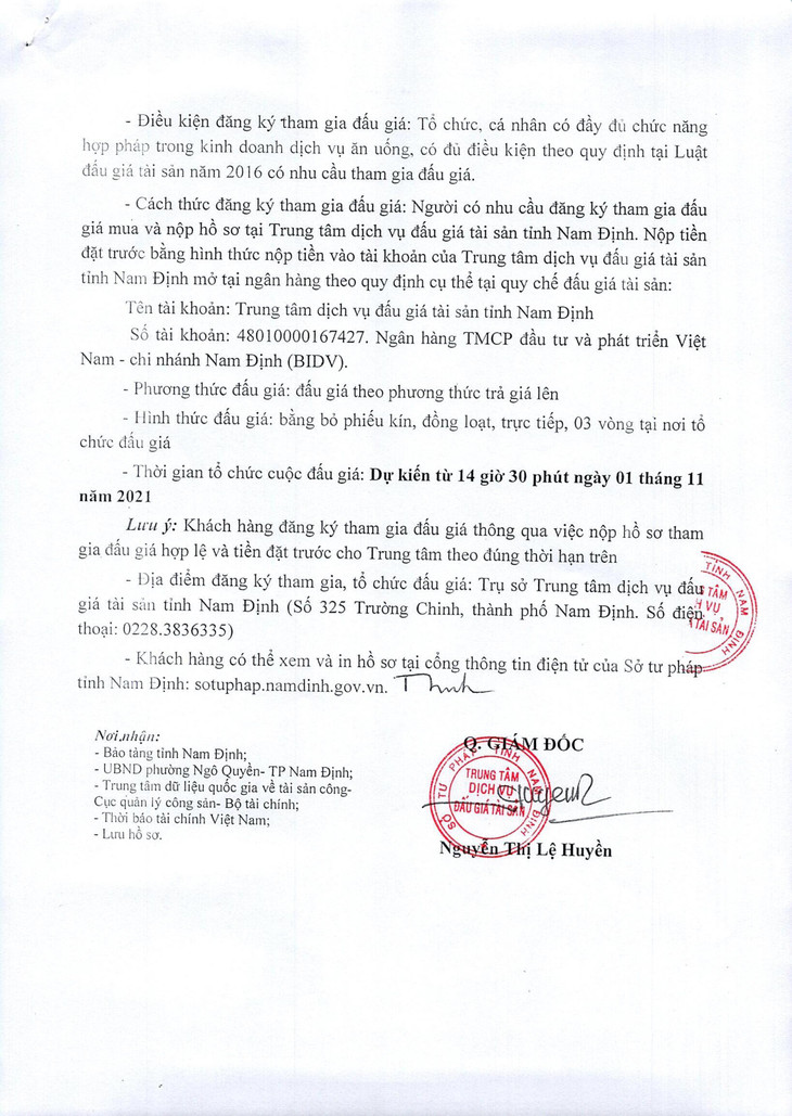 (BĐT) - Trung tâm Dịch vụ đấu giá tài sản tỉnh Nam Định thông báo đấu giá tài sản vào ngày 1/11/2021 do Bảo tàng tỉnh Nam Định ủy quyền như sau: