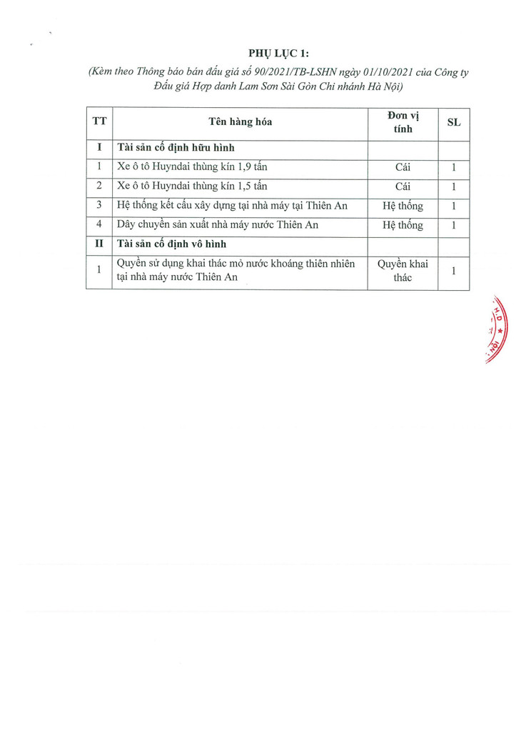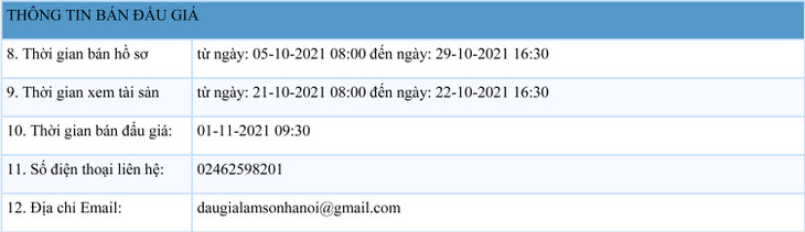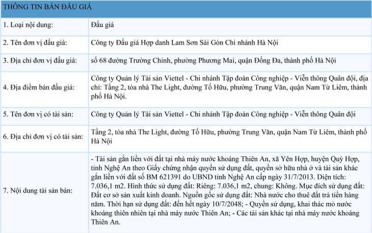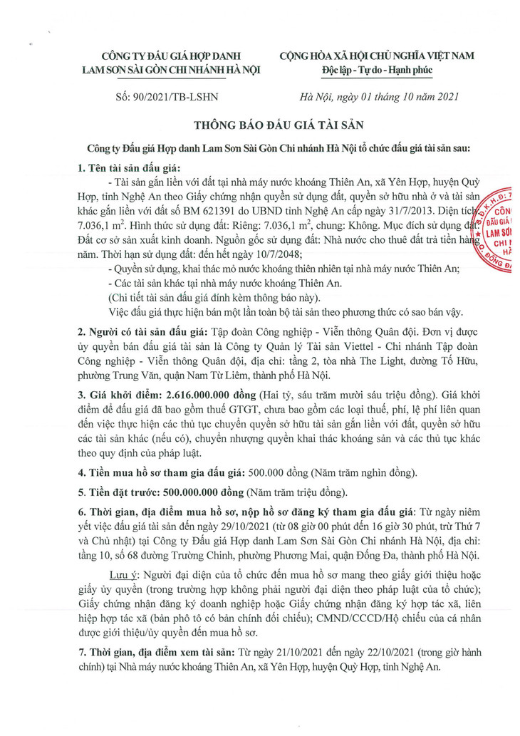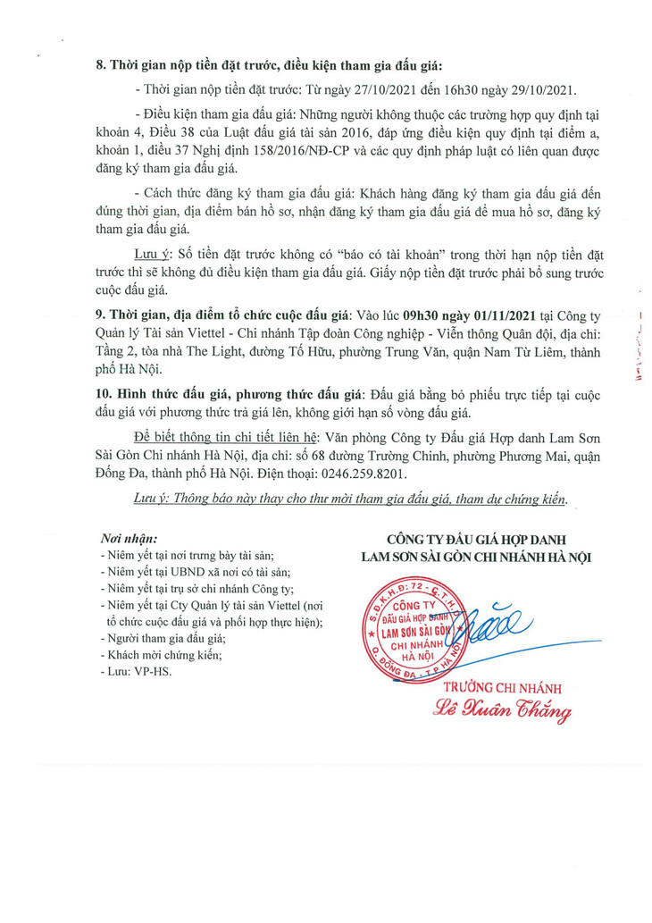 (BĐT) - Công ty Đấu giá hợp danh Lam Sơn Sài Gòn Chi nhánh Hà Nội thông báo đấu giá tài sản vào ngày 1/11/2021 do Công ty Quản lý Tài sản Viettel - Chi nhánh Tập đoàn Công nghiệp - Viễn thông Quân đội ủy quyền như sau: