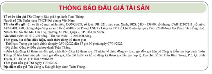 (BĐT) - Công ty Đấu giá hợp danh Toàn Thắng thông báo đấu giá tài sản vào ngày 11/1/2022 do Ngân hàng TMCP Đại chúng Việt Nam ủy quyền như sau:
