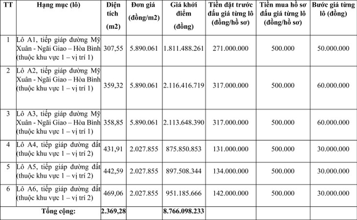3. Tổng giá khởi điểm của khu đất diện tích 2.369,3 m2 (gồm 06 lô đất): 8.766.098.233 đồng (Bằng chữ: Tám tỷ, bảy trăm sáu mươi sáu triệu, không trăm chín mươi tám ngàn, hai trăm ba mươi ba đồng).