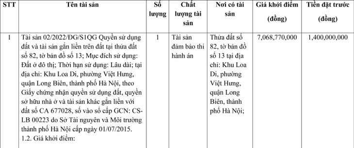 Tên Người có tài sản đấu giá: Chi cục Thi hành án dân sự quận Long Biên