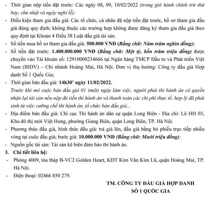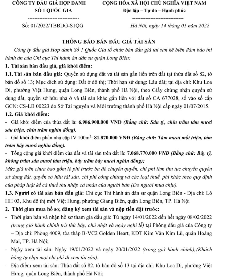 Tổ chức đấu giá tài sản: Công ty đấu giá hợp danh Số 1 Quốc gia