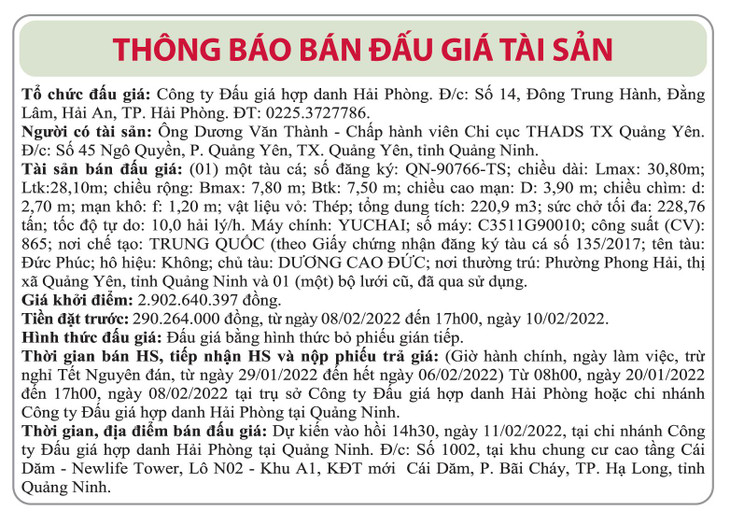 Ngày 11/2/2022, đấu giá tàu đánh cá vỏ thép tại tỉnh Quảng Ninh