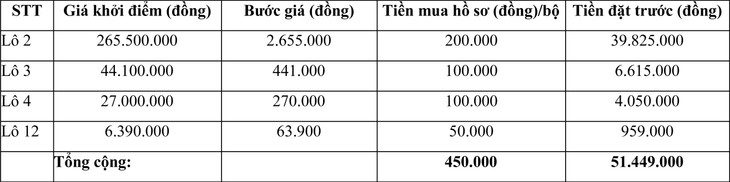 2. Giá khởi điểm, bước giá, tiền mua hồ sơ, tiền đặt trước: