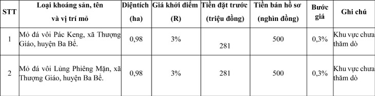Ghi chú: Khu vực mỏ đá vôi Pác Keng, xã Thượng Giáo và mỏ đá vôi Lủng Phiêng Mặn, xã Thượng Giáo, huyện Ba Bể, tỉnh Bắc Kạn chưa có kết quả thăm dò khoáng sản: Tổ chức, cá nhân tham gia đấu giá phải có kế hoạch sơ bộ việc đầu tư thăm dò, khai thác, chế biến sâu, tiêu thụ sản phẩm và bản cam kết thực hiện nếu trúng đấu giá.