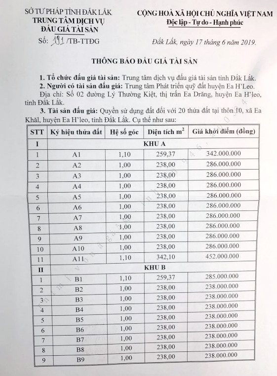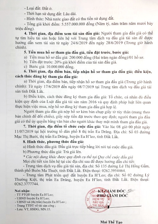 (BĐT) - Trung tâm Dịch vụ đấu giá tài sản tỉnh Đăk Lăk thông báo bán đấu giá tài sản vào ngày 11/7/2019 do Trung tâm phát triển quỹ đất huyện Ea H’Leo ủy quyền như sau: