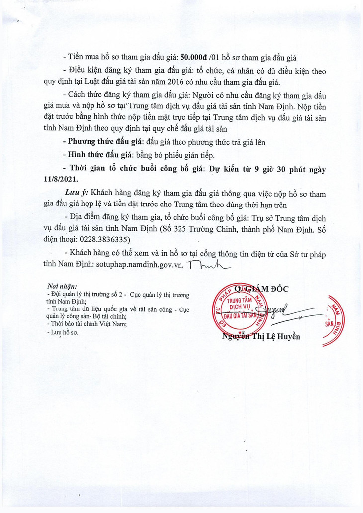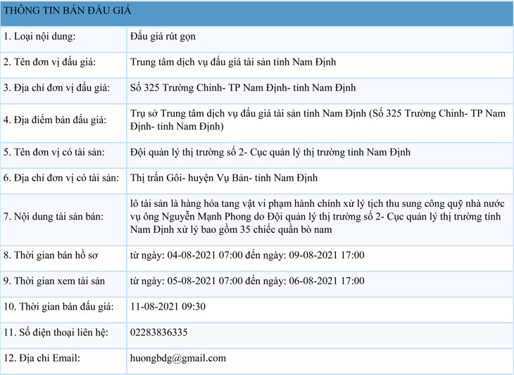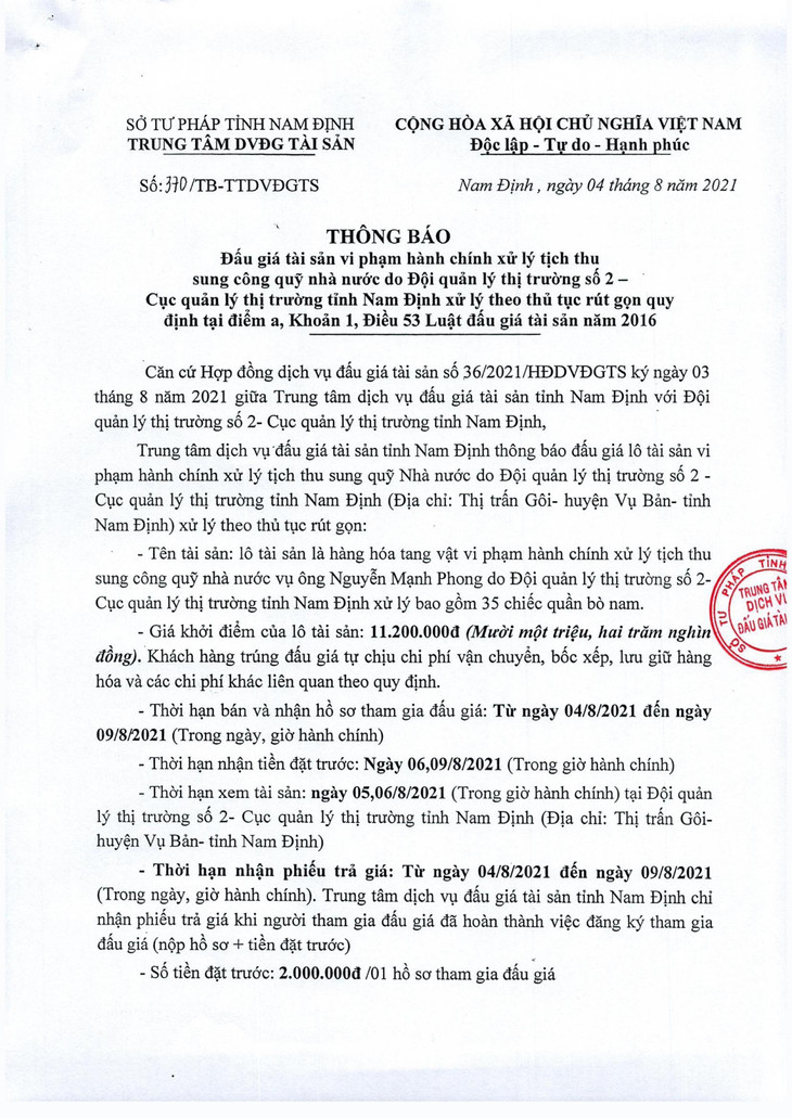Lô tài sản là hàng hóa tang vật vi phạm hành chính xử lý tịch thu sung công quỹ nhà nước vụ ông Nguyễn Mạnh Phong do Đội quản lý thị trường số 2- Cục quản lý thị trường tỉnh Nam Định xử lý bao gồm 35 chiếc quần bò nam.