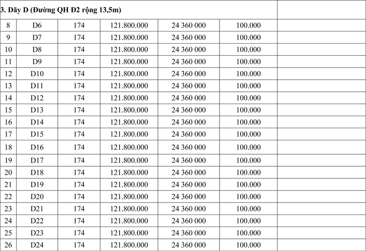 - Tiền đặt trước: 20% (Hai mươi phần trăm) giá khởi điểm của từng lô đất.