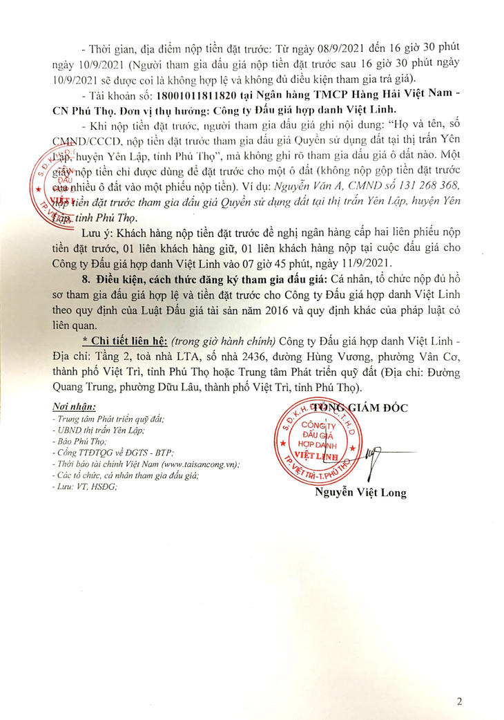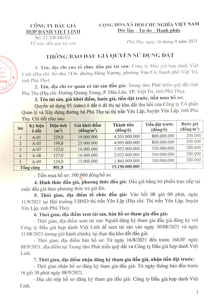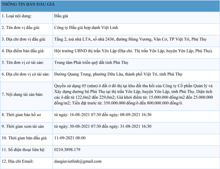 (BĐT) - Công ty Đấu giá hợp danh Việt Linh thông báo đấu giá tài sản vào ngày 11/9/2021 do Trung tâm Phát triển quỹ đất tỉnh Phú Thọ ủy quyền như sau: