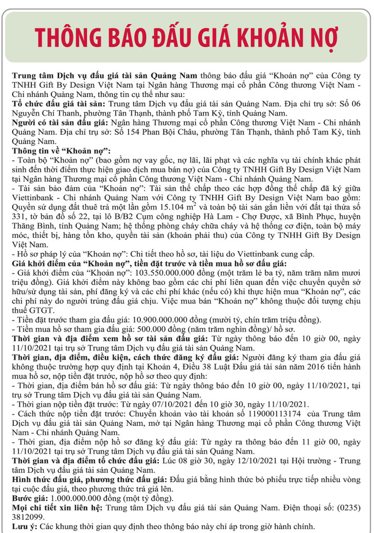 Ngày 12/10/2021, đấu giá khoản nợ của Công ty TNHH Gift By Design Việt Nam tại Vietinbank Chi nhánh Quảng Nam
