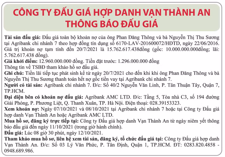 Ngày 12/10/2021, đấu giá toàn bộ khoản nợ của ông Phan Đăng Thông và bà Nguyễn Thị Thu Sương tại Agribank Chi nhánh 7