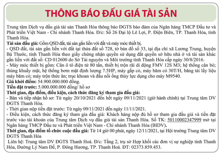 (BĐT) - Trung tâm Dịch vụ đấu giá tài sản Thanh Hóa thông báo đấu giá tài sản vào ngày 12/11/2021 do Ngân hàng TMCP Đầu tư và Phát triển Việt Nam Chi nhánh Thanh Hóa ủy quyền như sau: