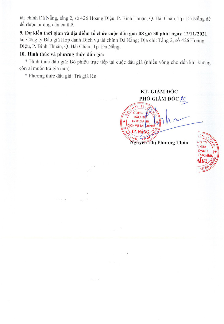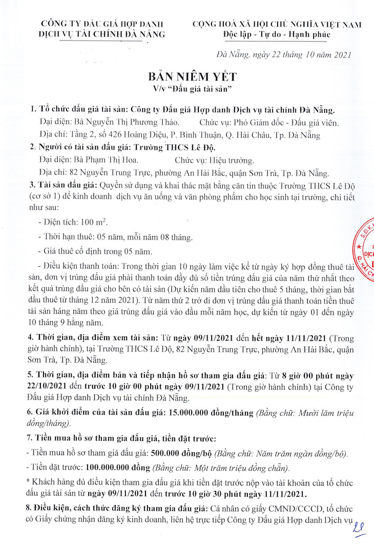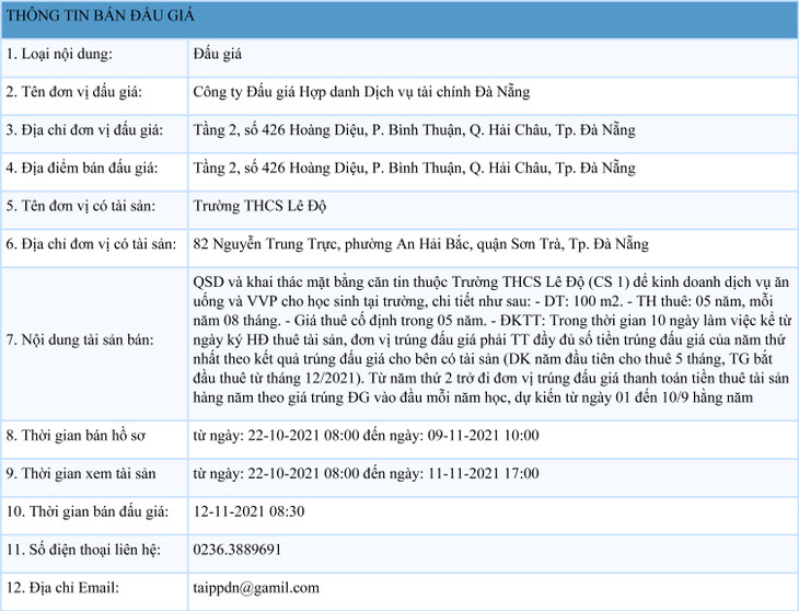 (BĐT) - Công ty Đấu giá hợp danh Dịch vụ tài chính Đà Nẵng thông báo đấu giá tài sản vào ngày 12/11/2021 do Trường THCS Lê Độ (cơ sở 1) ủy quyền như sau: