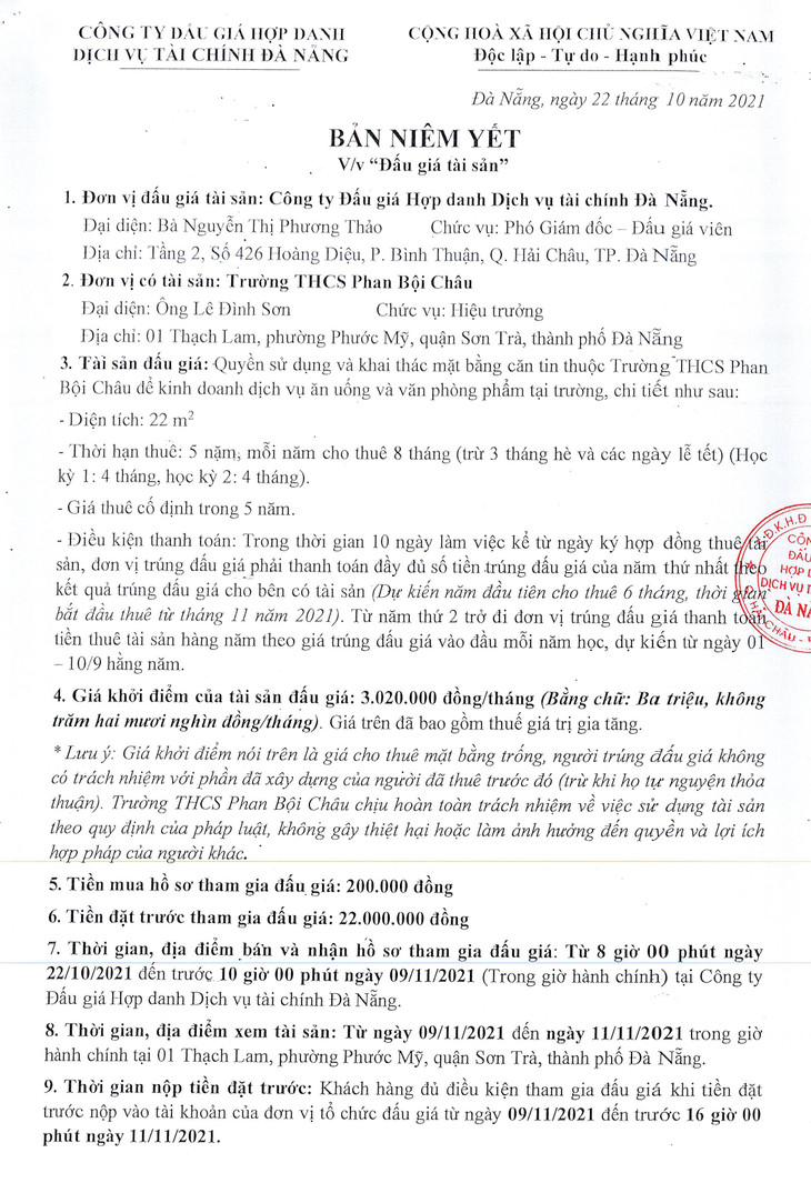(BĐT) - Công ty Đấu giá hợp danh Dịch vụ tài chính Đà Nẵng thông báo đấu giá tài sản vào ngày 12/11/2021 do Trường THCS Phan Bội Châu ủy quyền như sau: