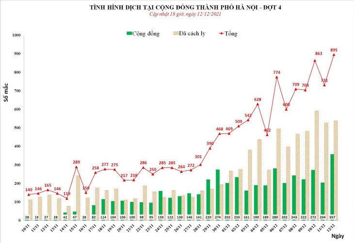 - Số ca mắc mới từ 18h ngày 11/12 đến 18h ngày 12/12 Hà Nội ghi nhận 895 ca bệnh trong đó: cộng đồng 357 ca, khu cách ly 472 ca, khu phong tỏa 66 ca.