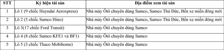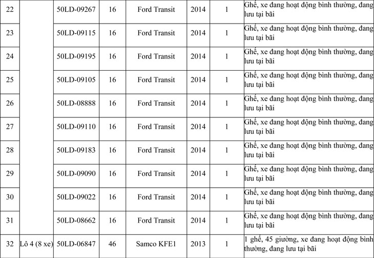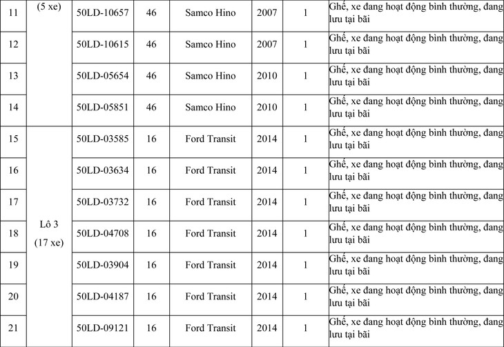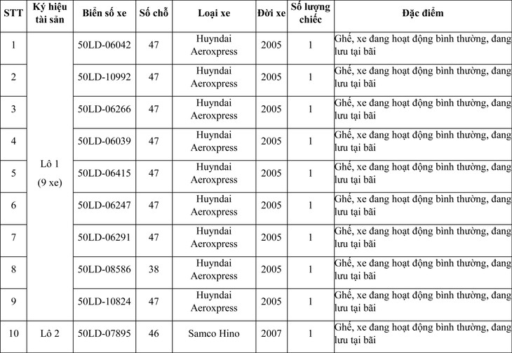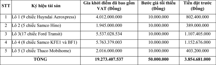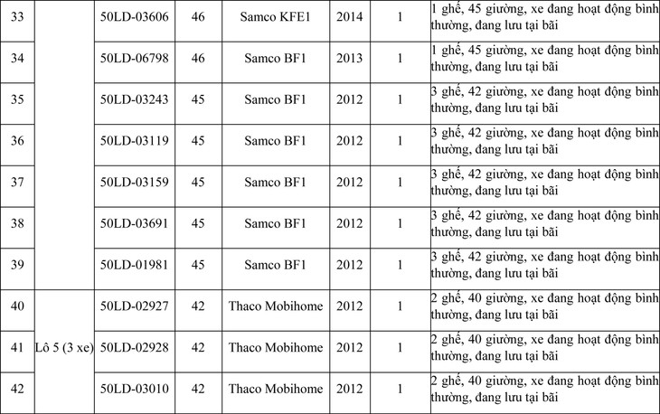 - Xe ô tô thanh lý gồm 42 xe, được chia thành 05 lô.