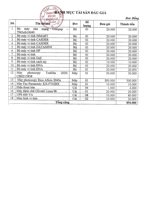 3. Tài sản bán đấu giá gồm: 18 loại tài sản đã qua sử dụng hư hỏng (Theo danh mục chi tiết); Tổng giá khởi điểm: 894.000 đồng (Tám trăm chín mươi tư ngàn đồng); Địa chỉ tài sản tại: Sở Tư pháp tỉnh Gia Lai.