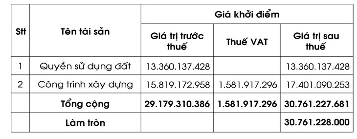 - Giá khởi điểm: 30.761.228.00 VNĐ (Bằng chữ: Ba mươi tỷ, bảy trăm sáu mươi mốt triệu, hai trăm hai mươi tám ngàn đồng chẵn), đã bao gồm thuế VAT, cụ thể: