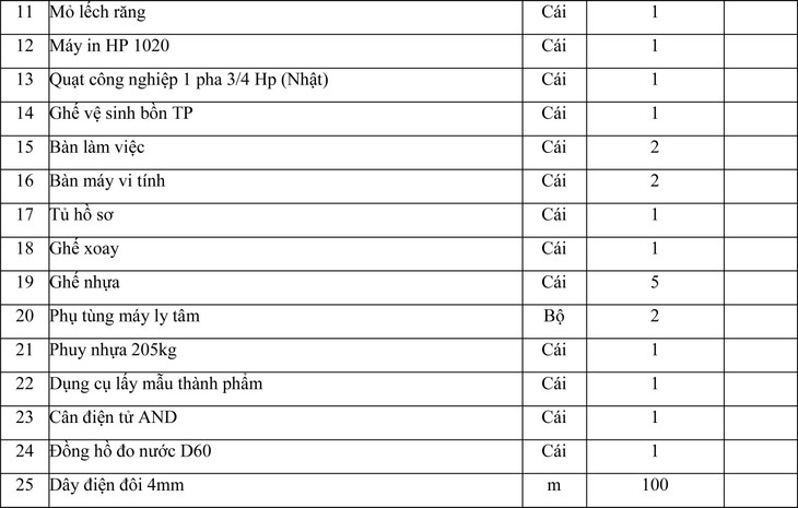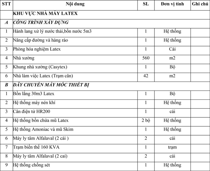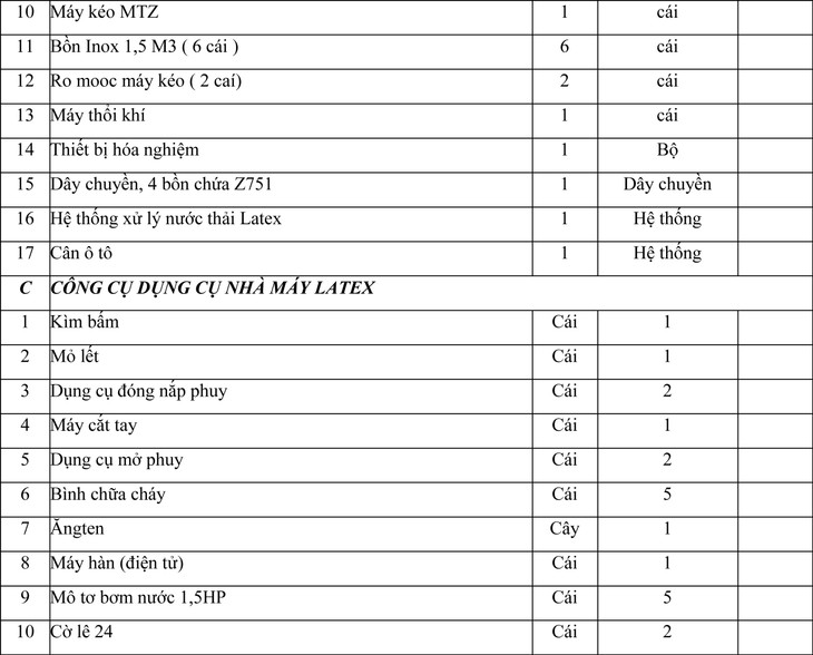 I - TÀI SẢN BÁN THANH LÝ THÁO DỞ NHÀ MÁY LATEX