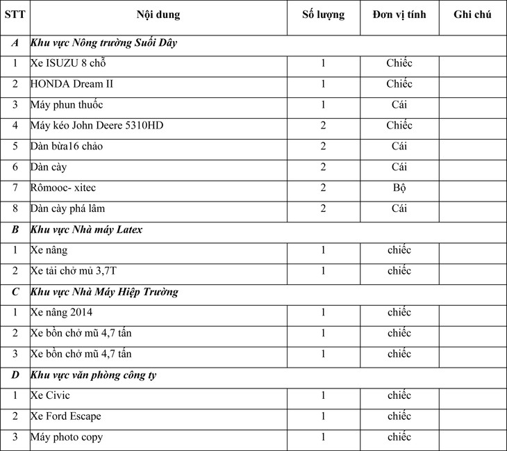 Đấu giá tài sản thanh lý của Công ty Cổ phần cao su 1-5 Tây Ninh, như sau: