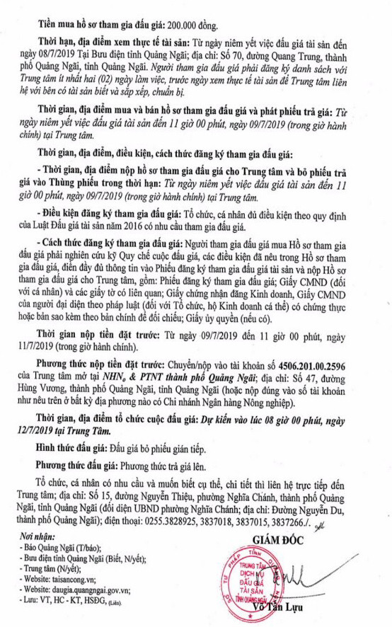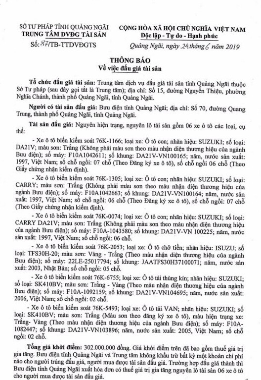 (BĐT) - Trung tâm Dịch vụ đấu giá tài sản tỉnh Quảng Ngãi - Sở Tư pháp tỉnh Quảng Ngãi thông báo bán đấu giá tài sản vào ngày 12/7/2019 do Bưu điện tỉnh Quảng Ngãi ủy quyền như sau: