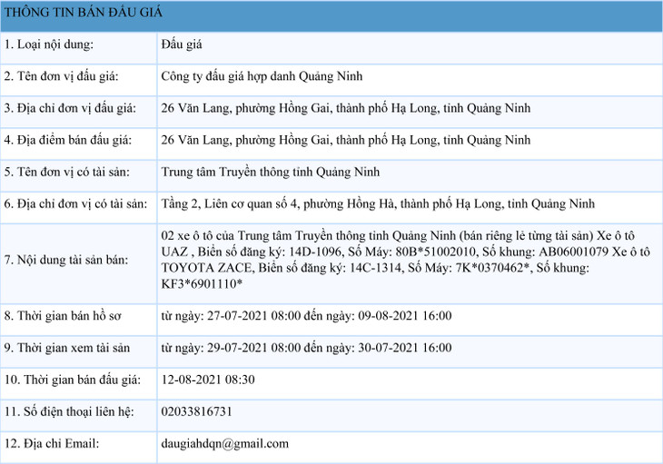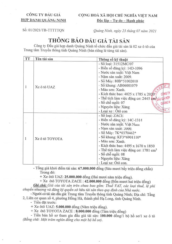 02 xe ô tô của Trung tâm Truyền thông tỉnh Quảng Ninh (bán riêng lẻ từng tài sản) Xe ô tô UAZ, Biển số đăng ký: 14D-1096, Số Máy: 80B*51002010, Số khung: AB06001079 Xe ô tô TOYOTA ZACE, Biển số đăng ký: 14C-1314, Số Máy: 7K*0370462*, Số khung: KF3*6901110*