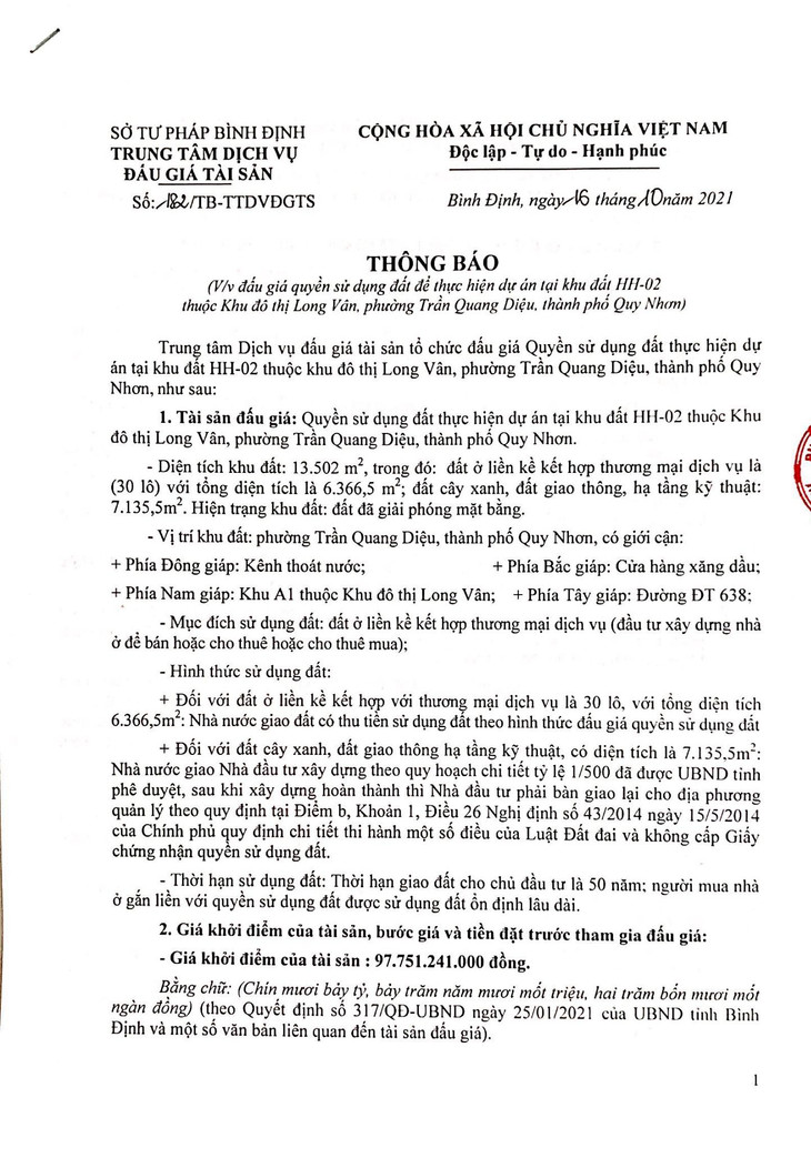 Quyền sử dụng đất thực hiện dự án tại khu đất HH-02 thuộc Khu đô thị Long Vân, phường Trần Quang Diệu, thành phố Quy Nhơn.