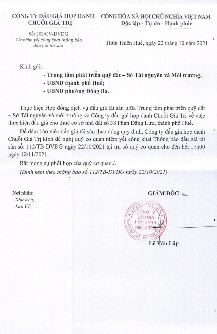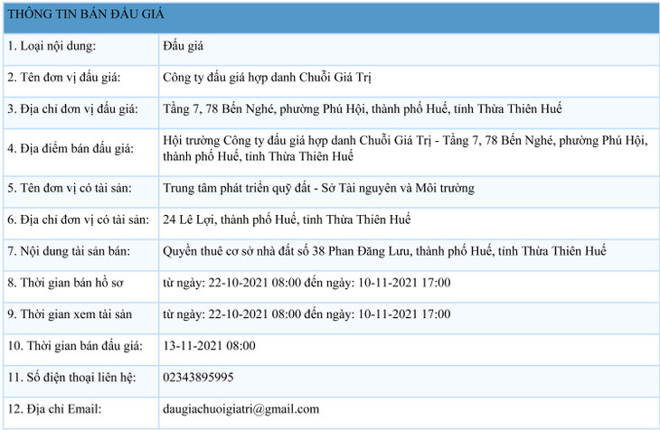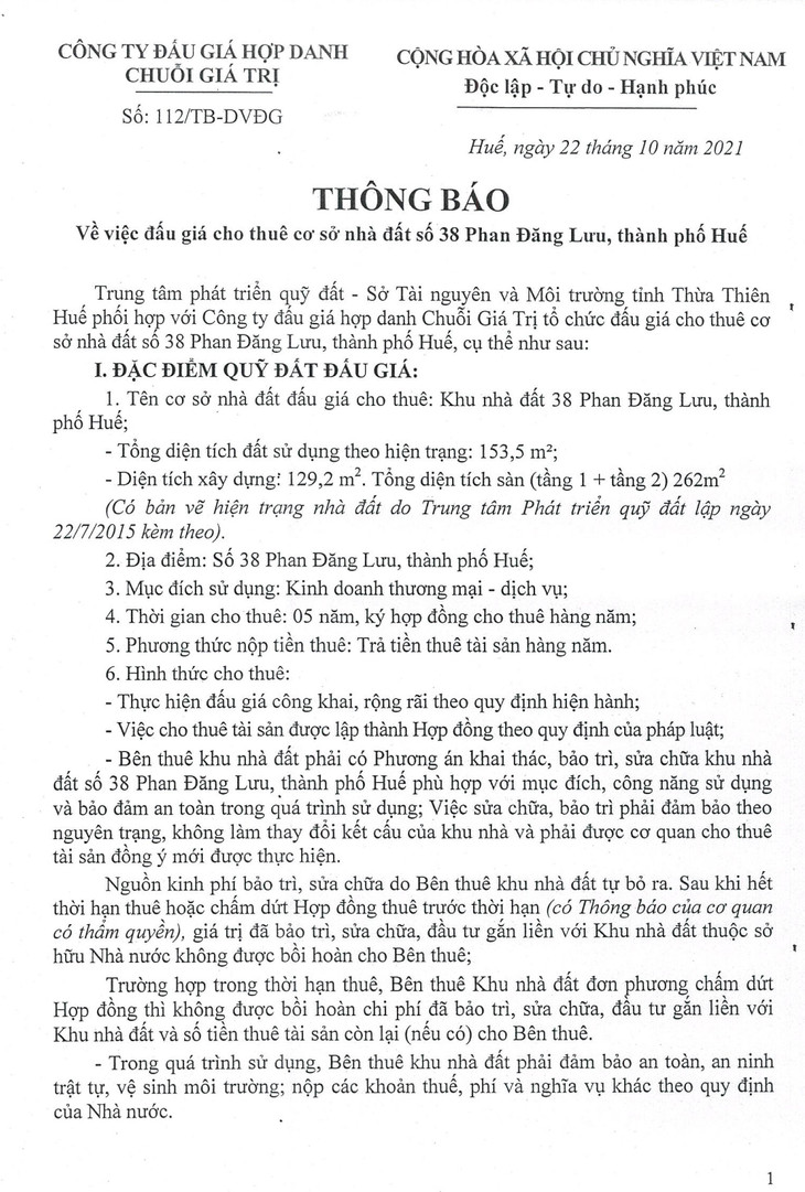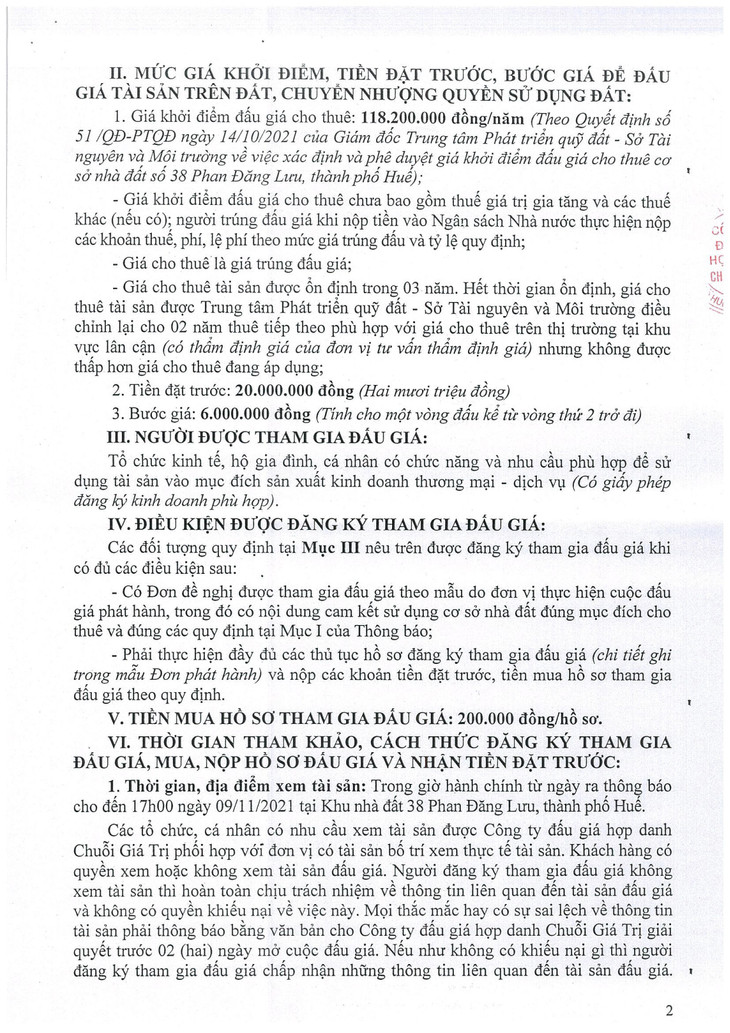 Quyền thuê cơ sở nhà đất số 38 Phan Đăng Lưu, thành phố Huế, tỉnh Thừa Thiên Huế