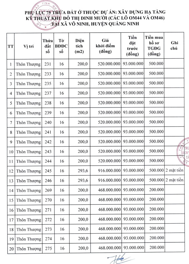 - Xã Võ Ninh: Quyền sử dụng đất đối với 75 thửa đất ở thuộc Dự án: Xây dựng hạ tầng kỹ thuật khu đô thị Dinh Mười (các lô OM44 và OM46) tại xã Võ Ninh, huyện Quảng Ninh, tỉnh Quảng Bình - Đợt 1. Diện tích từ 200,0m2/thửa đến 293,6m2/thửa; Giá khởi điểm từ 468.000.000,đồng/thửa đến 916.000.000,đồng/thửa.