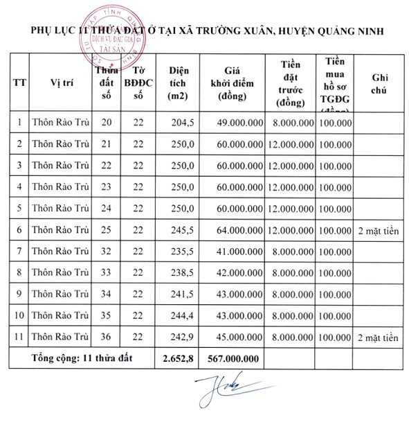 Danh mục, diện tích, vị trí, giá khởi điểm của từng thửa đất được niêm yết tại Trung tâm Dịch vụ đấu giá tài sản tỉnh Quảng Bình, Ban quản lý dự án Đầu tư xây dựng và Phát triển quỹ đất huyện Quảng Ninh và tại trụ sở UBND các xã Võ Ninh và xã Trường Xuân.