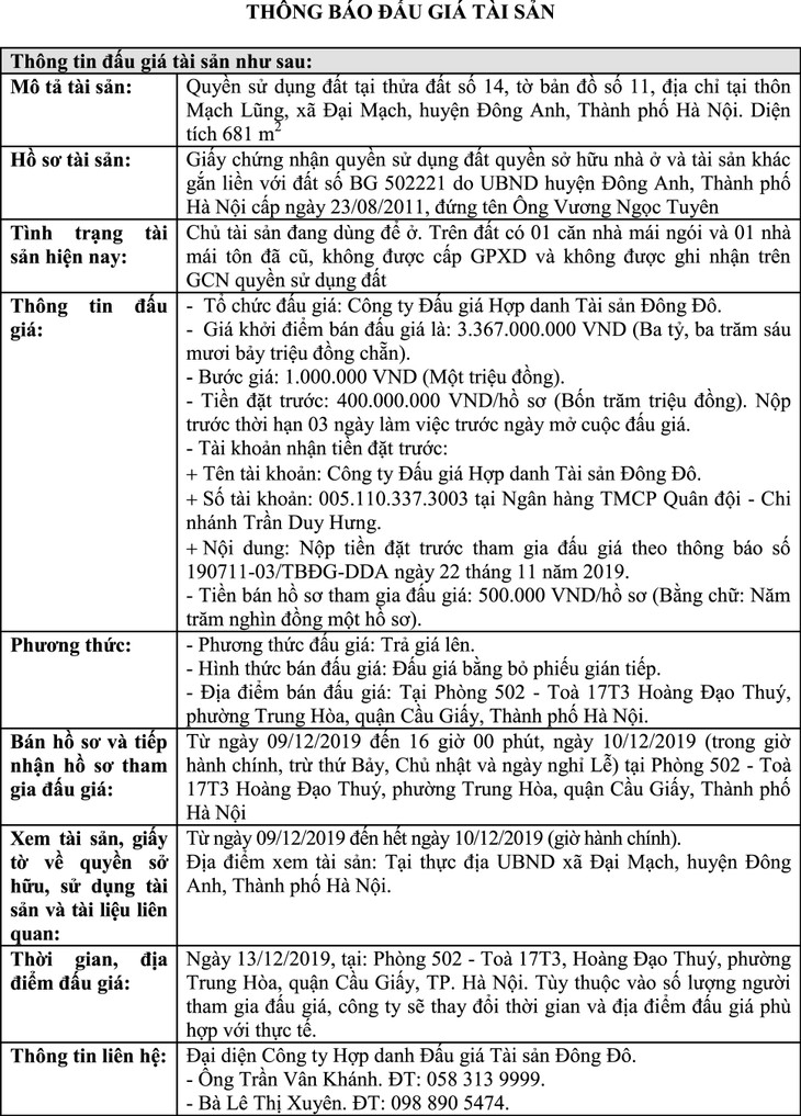 (BĐT) - Công ty Hợp danh Đấu giá Tài sản Đông Đô thông báo bán đấu giá tài sản vào ngày 13/12/2019 như sau: