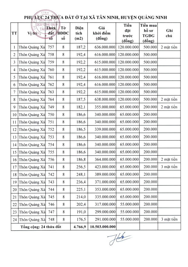 Danh mục, diện tích, vị trí, giá khởi điểm của từng thửa đất được niêm yết tại Trung tâm Dịch vụ đấu giá tài sản tỉnh Quảng Bình, Ban quản lý dự án Đầu tư xây dựng và Phát triển quỹ đất huyện Quảng Ninh và tại trụ sở UBND các xã An Ninh và xã Tân Ninh.