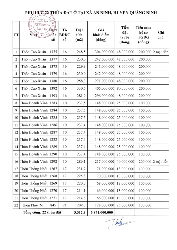 - Xã An Ninh: 22 thửa đất; Diện tích từ 209,0m2/thửa đến 330,5m2/thửa; Giá khởi điểm từ 66.000.000,đồng/thửa đến 405.000.000,đồng/thửa.